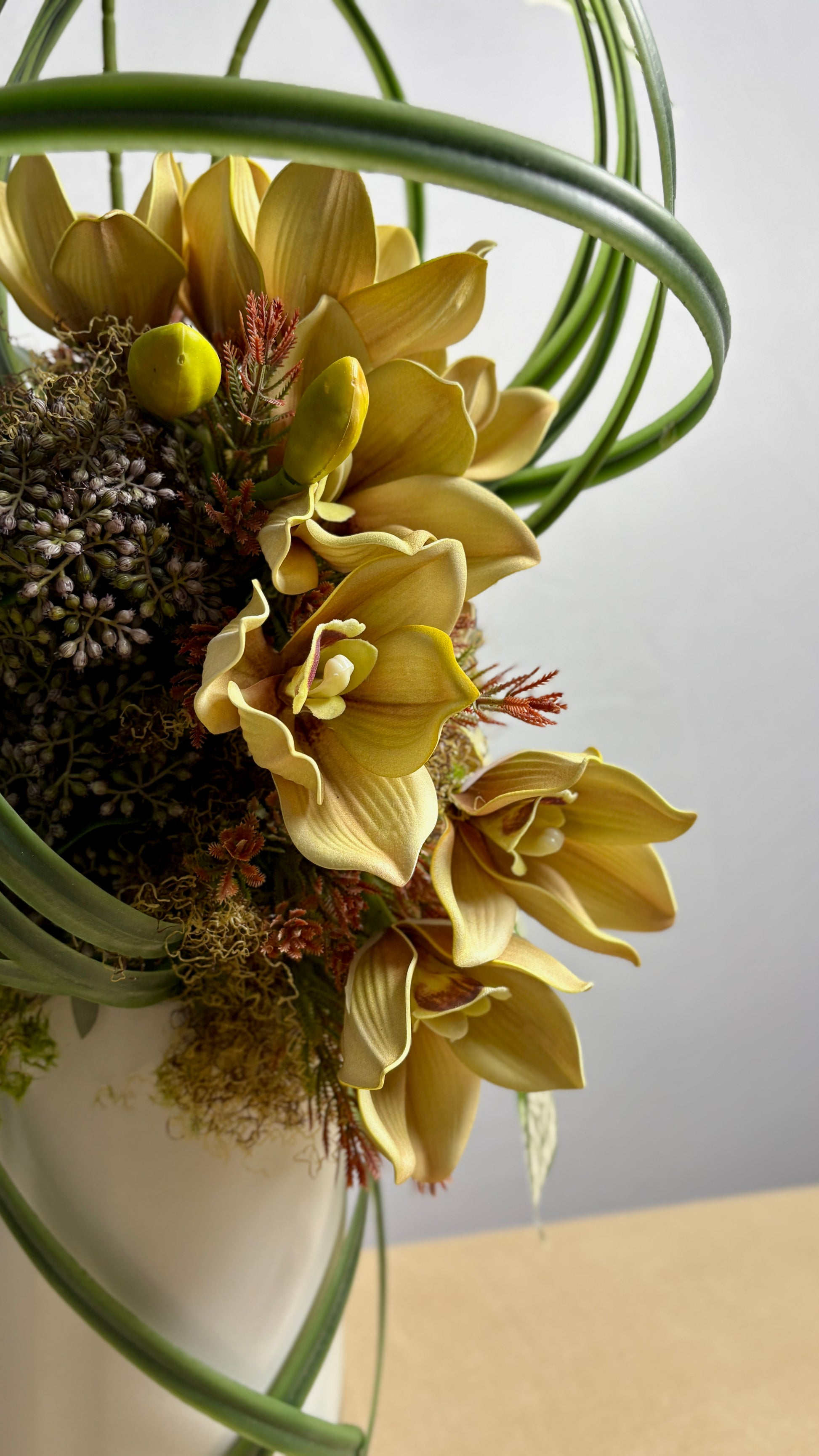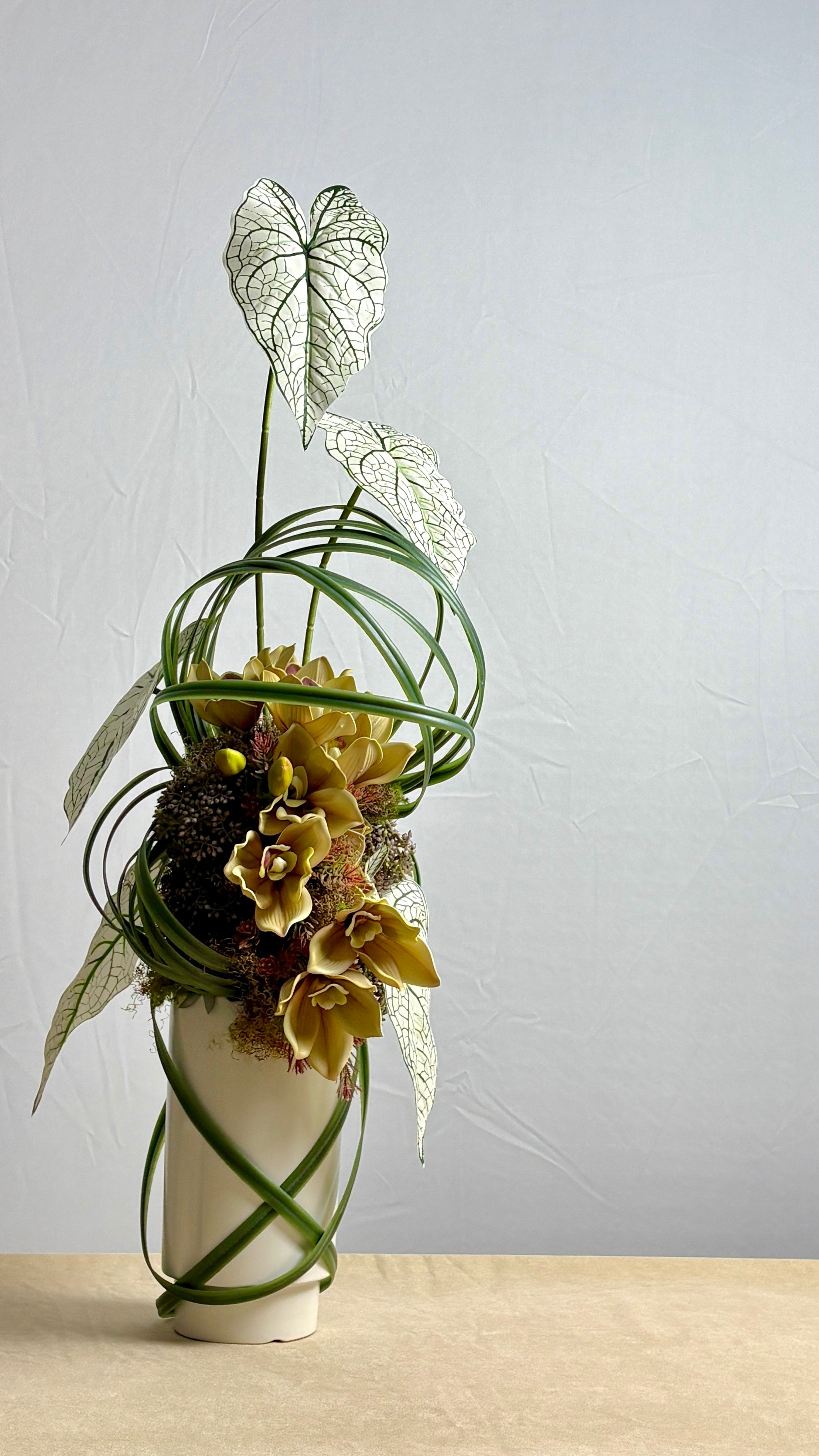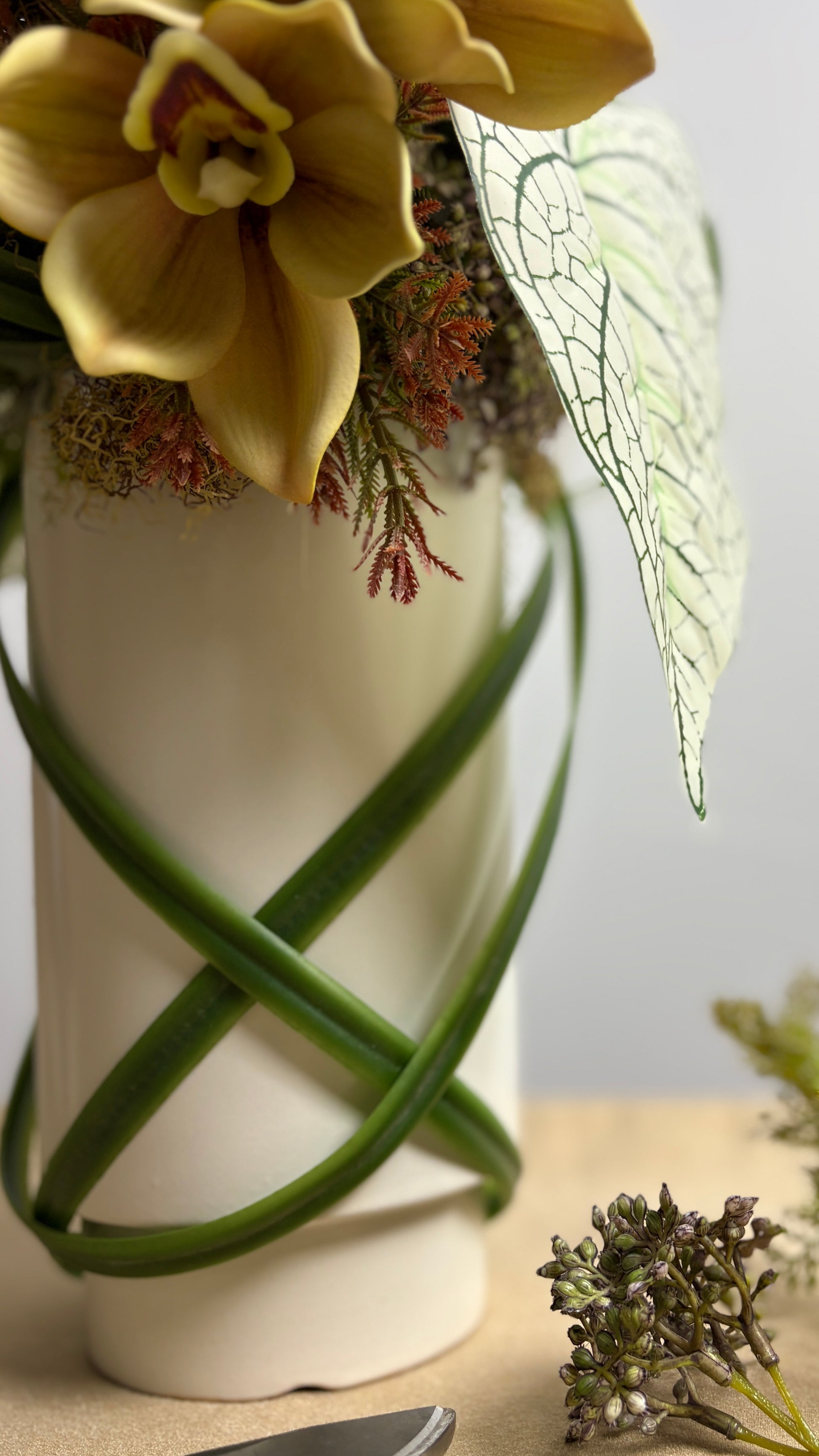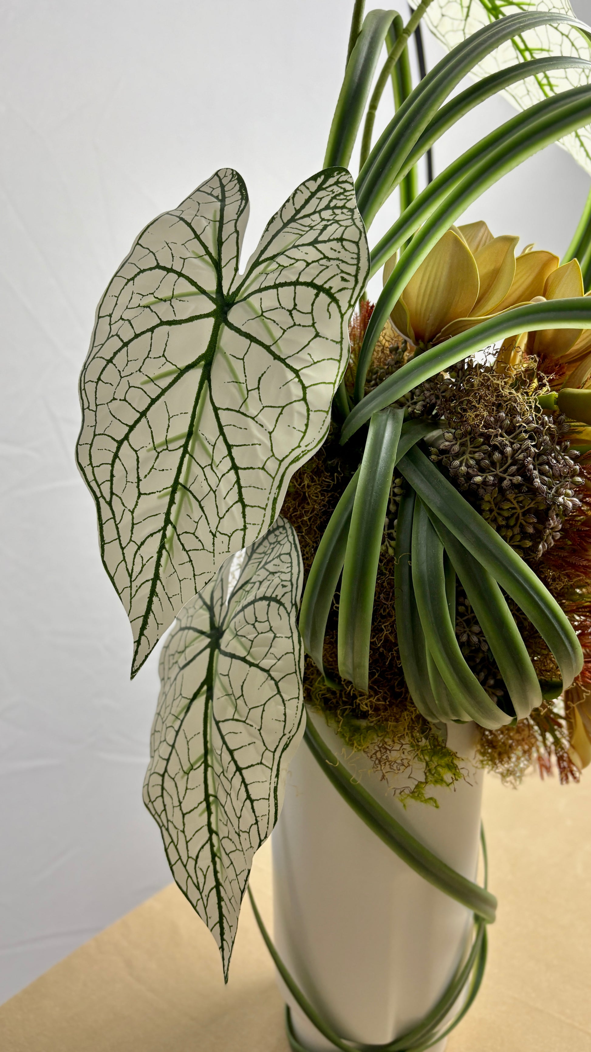 Leaf Flow features softly curved artificial caladium leaves that wrap around a ceramic vase in a quiet, flowing formation. The lines are natural and instinctual, giving the piece an airy presence with subtle structure. Designed as a standalone accent, this arrangement offers a quiet presence in thoughtfully styled interiors.