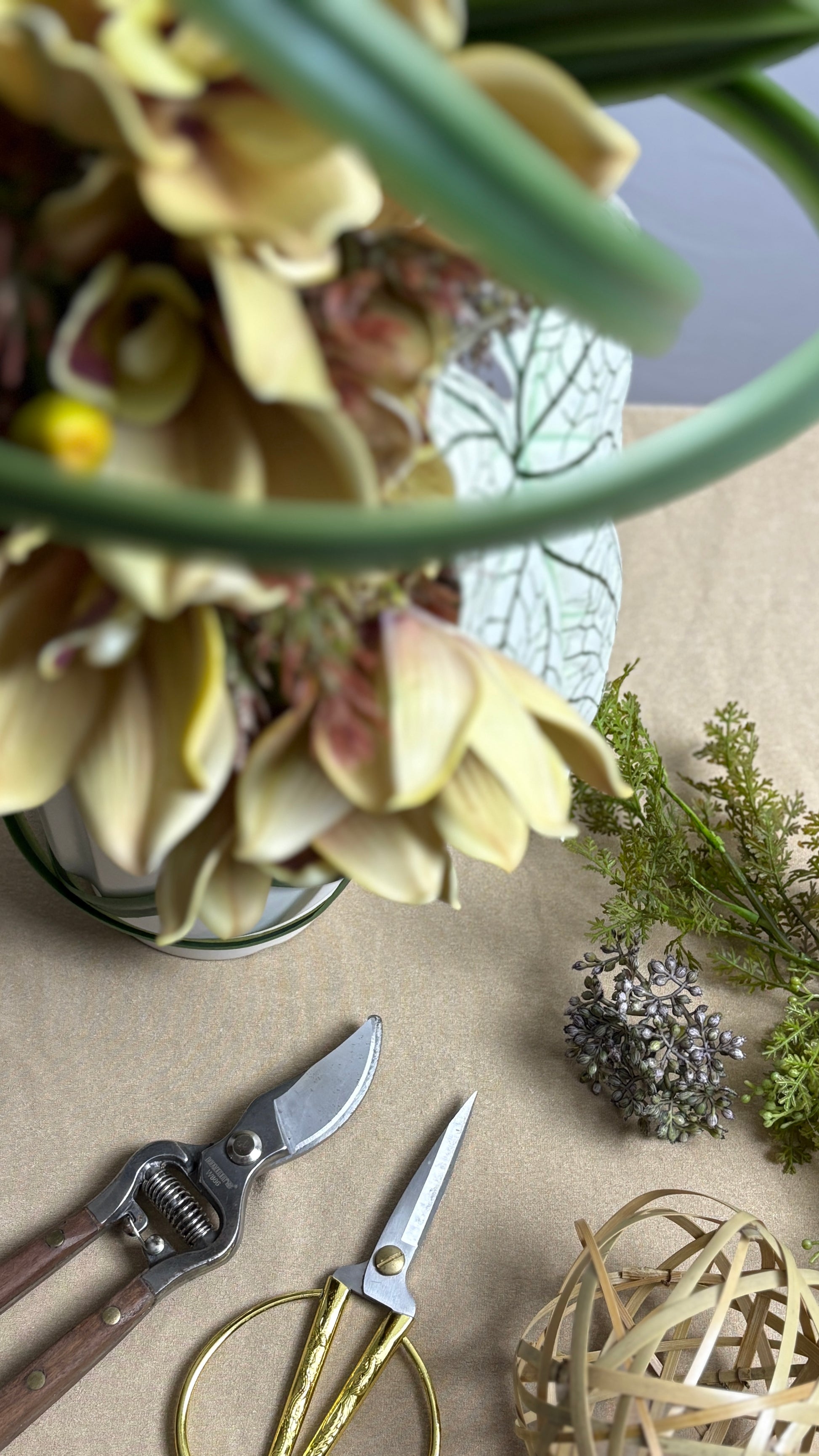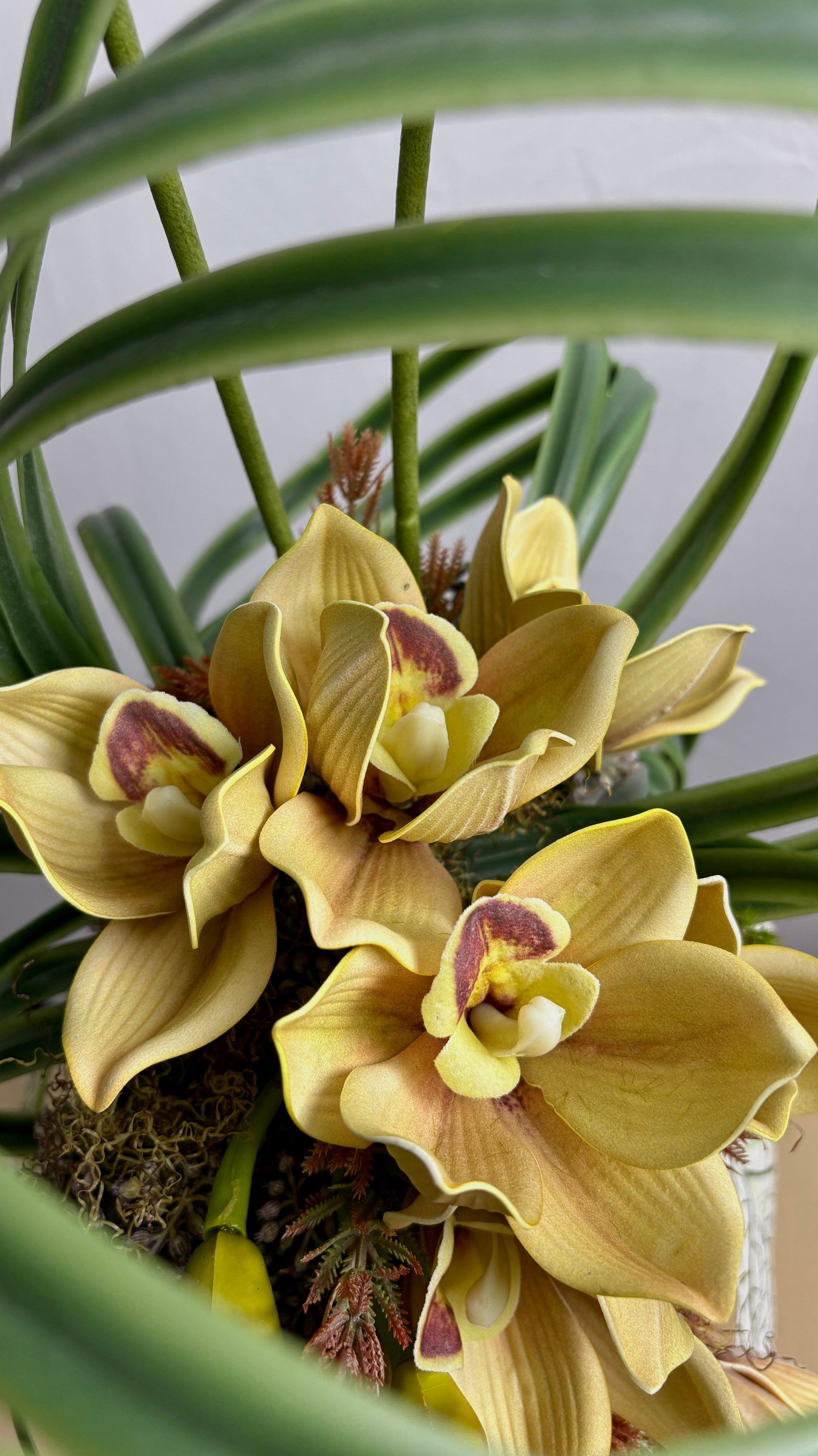 - Sculptural silhouette: Curved artificial leaves arranged for natural flow.