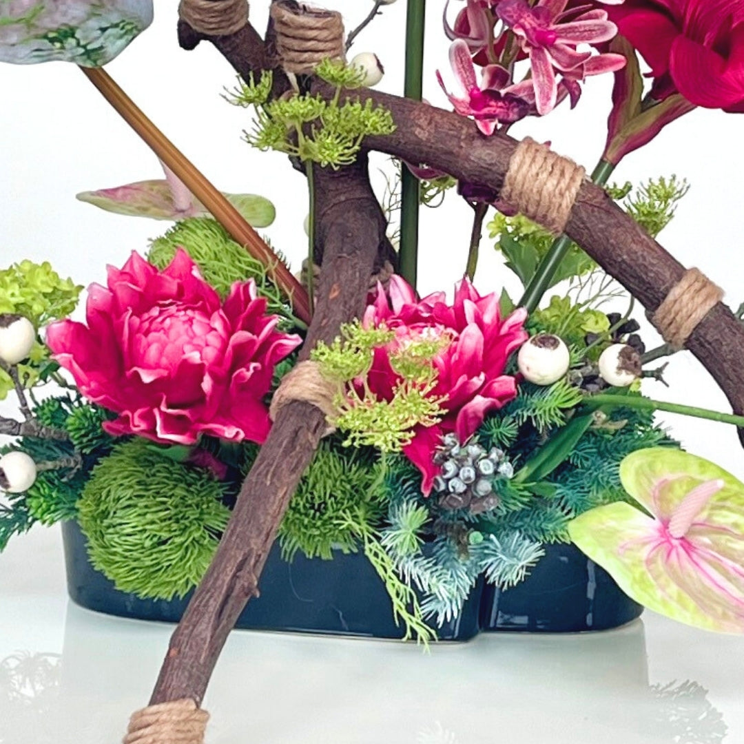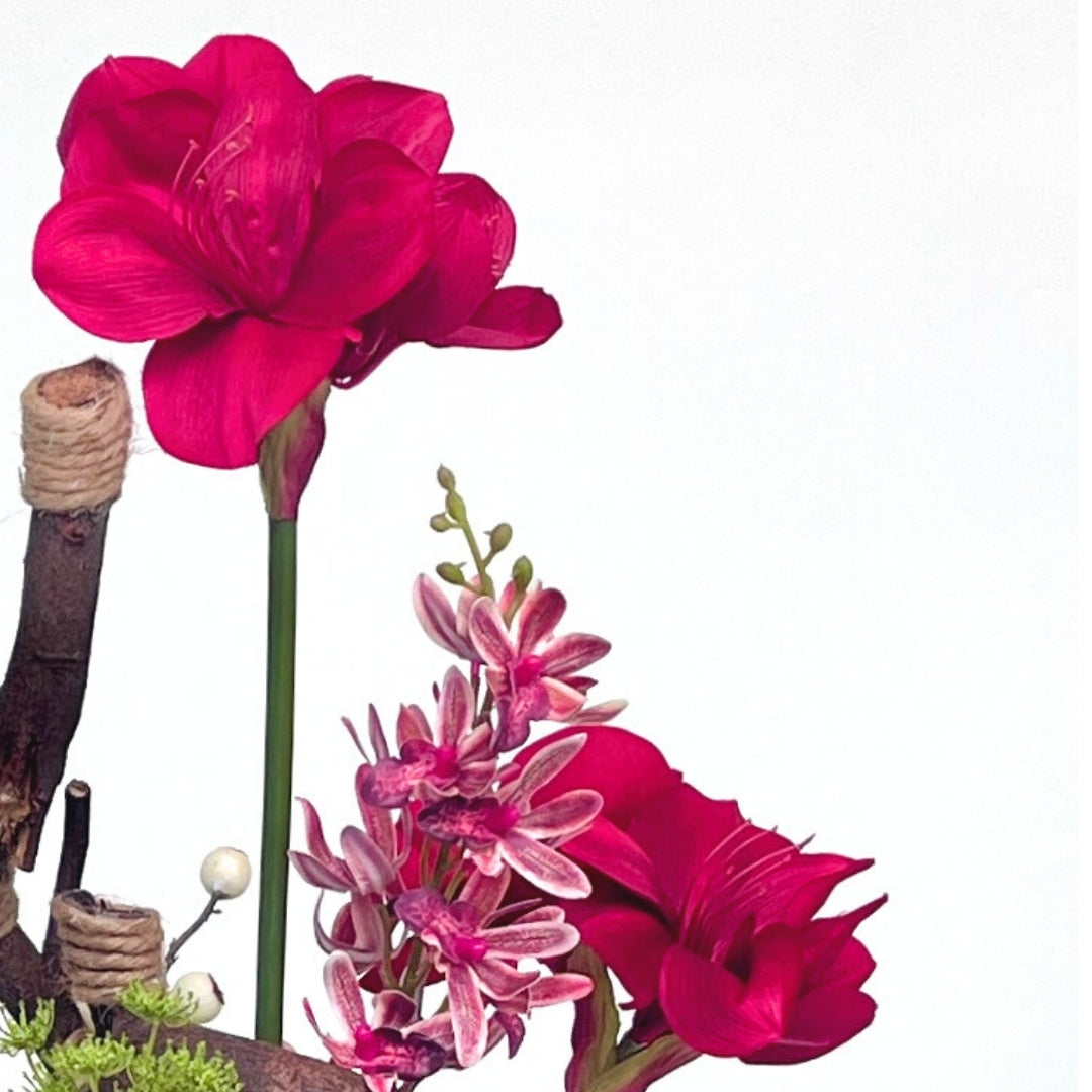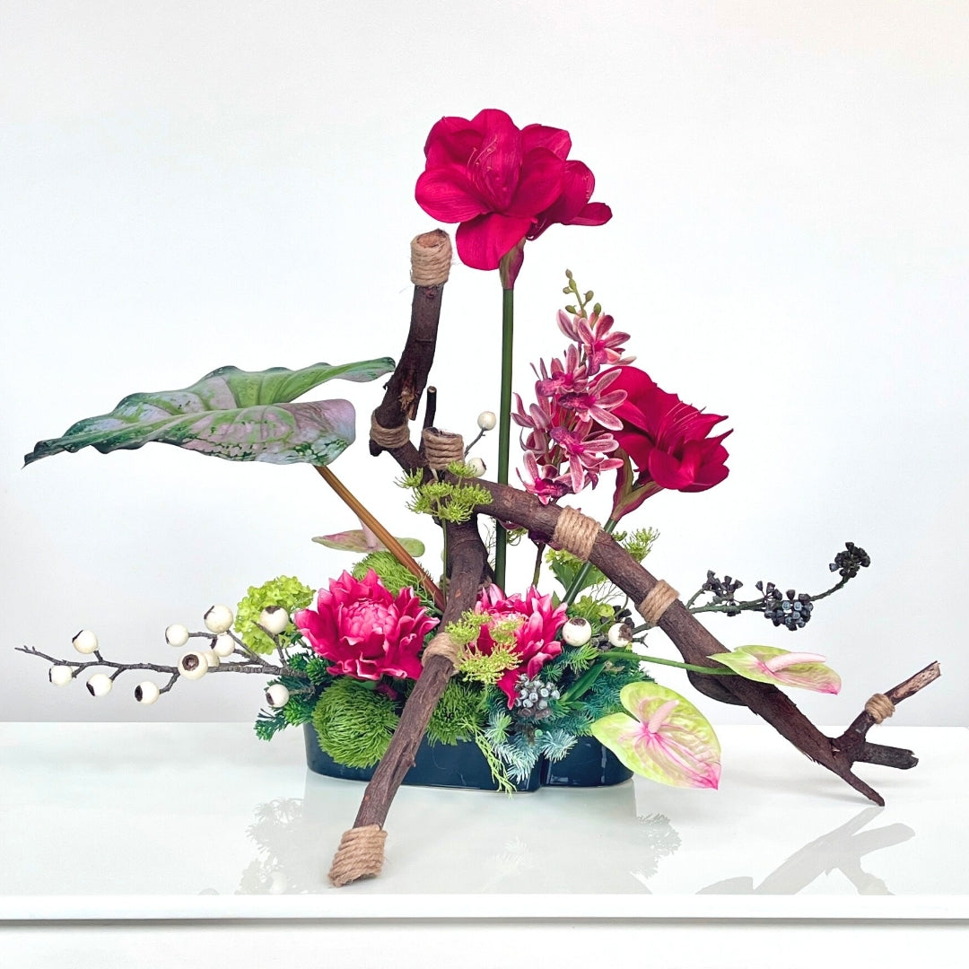 Scarlet Canopy commands attention with its striking combination of deep red Amaryllis flower and delicate pink Orchids, framed by a broad Alocasia leaf. The sculptural branches provide a powerful structure, enhancing the organic flow of the arrangement. Perfect for adding a dramatic flair to a modern interior.