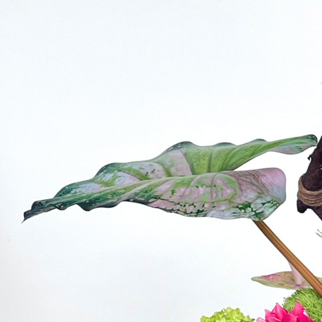 - Mixed-media design: High-quality artificial flowers paired with natural branches and large faux Alocasia leaf.