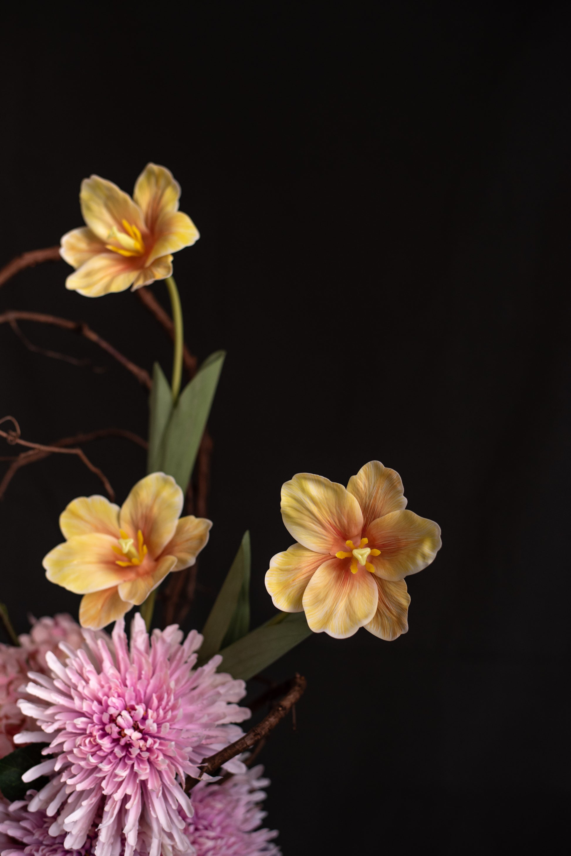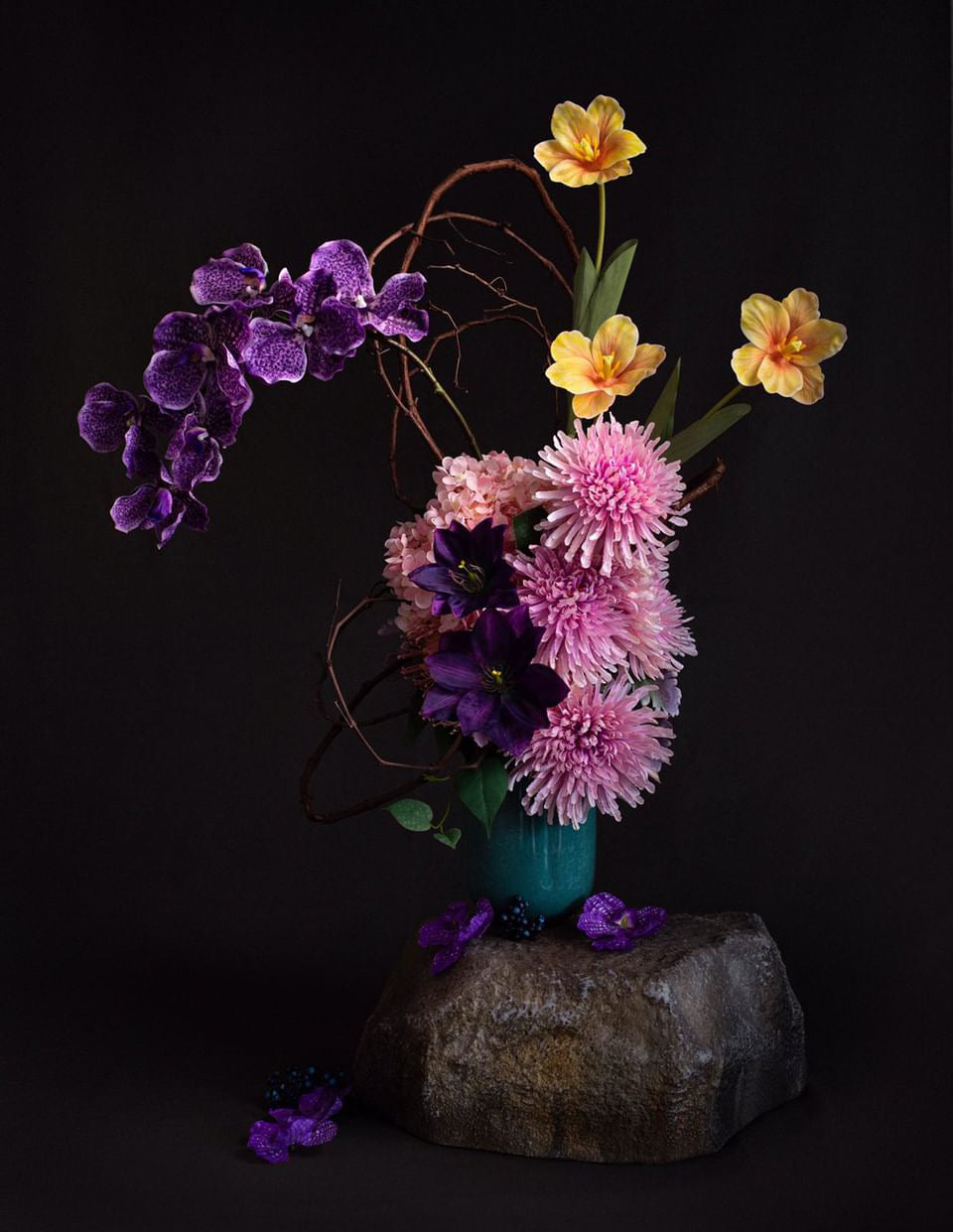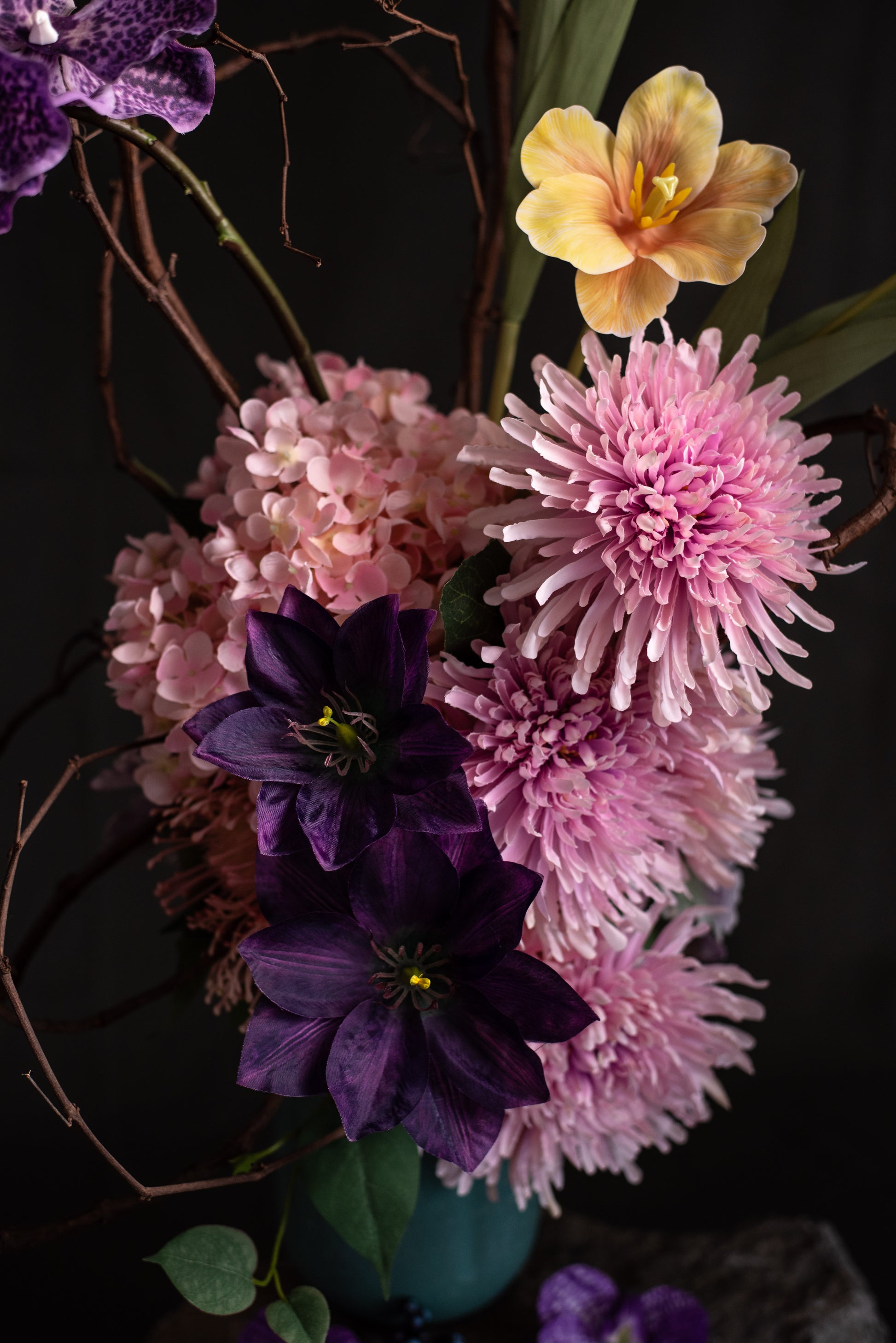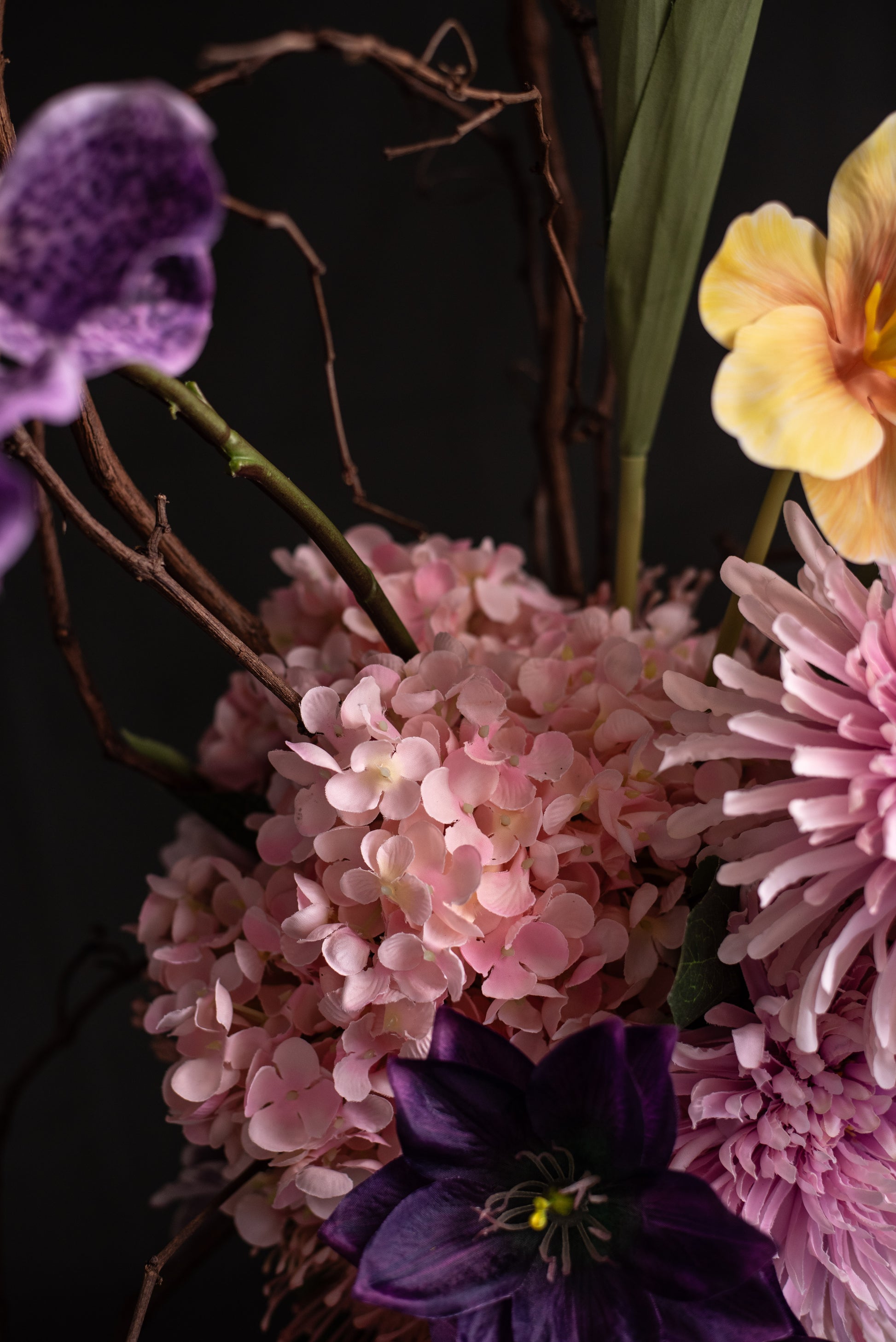 “Jewel” combines dramatic colors and dynamic shapes to create a striking floral piece that feels both exotic and luxurious. Featuring vivid purple Phalaenopsis orchids, yellow tulips, and deep plum clematis, this arrangement is anchored by lush pink dahlias, all artfully arranged with real twisting branches for added depth and movement.