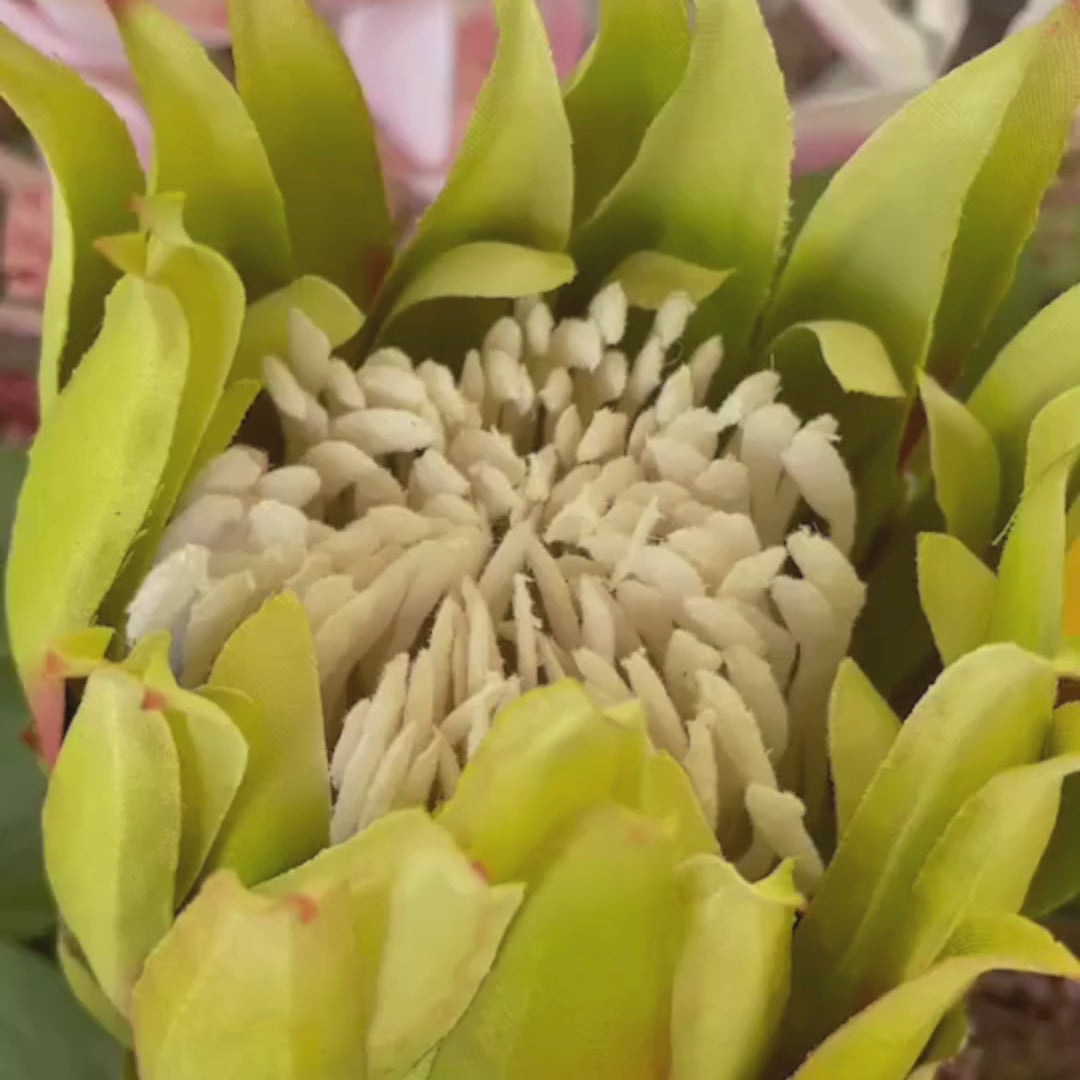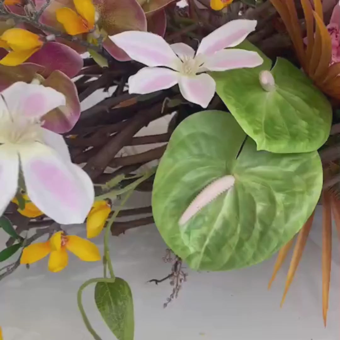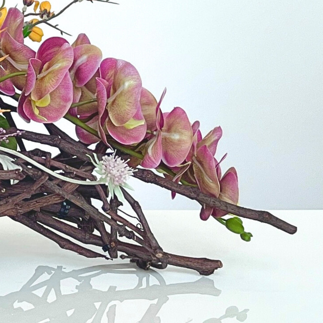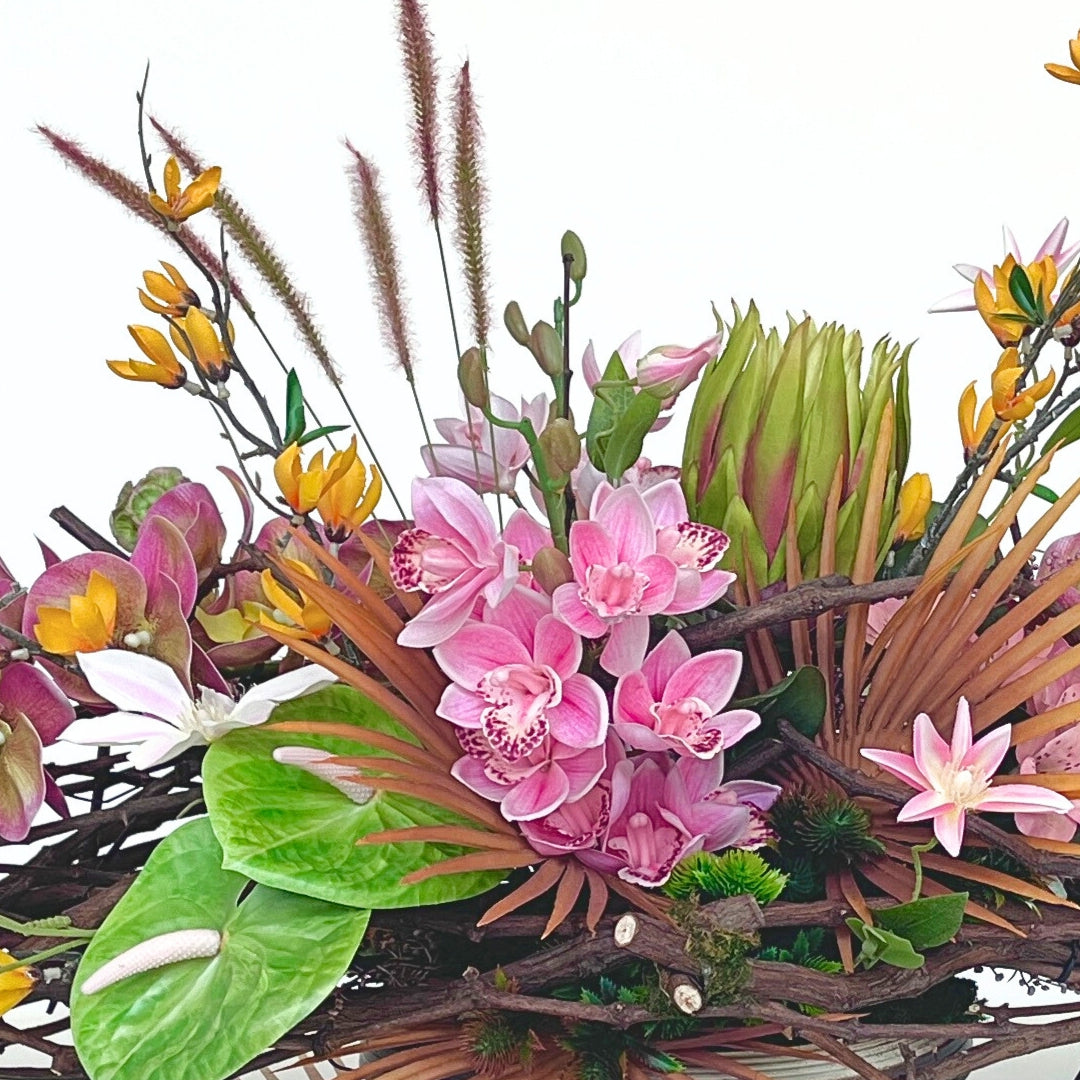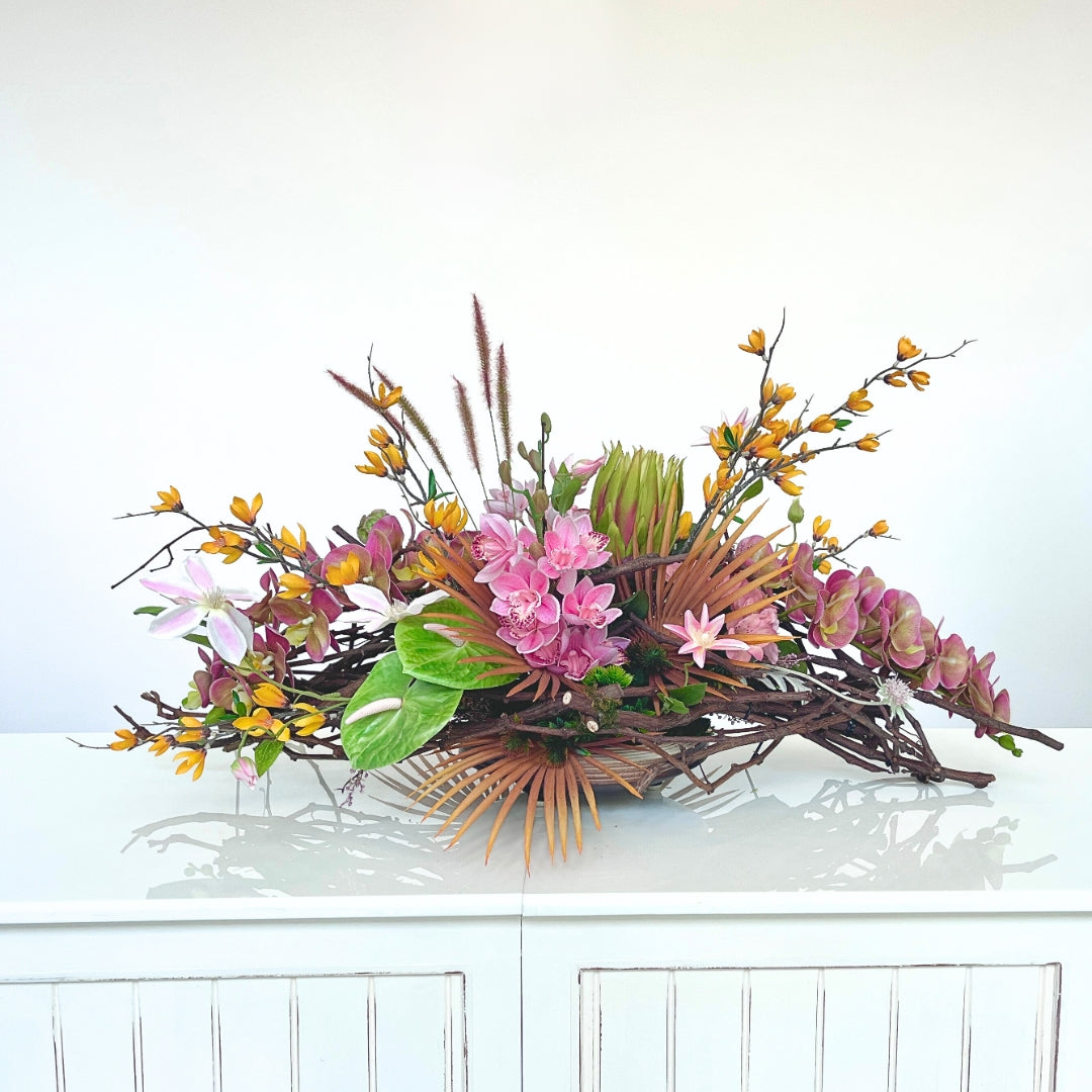 Tropical Tapestry bursts with vibrant hues and bold textures, making a statement centrepiece for any space. This striking design blends premium faux orchids, cymbidium, and lilies with vibrant yellow branches and tropical greenery, all interwoven with natural wood accents for added depth and structure. Perfect for a dining table or a sunlit entryway, this arrangement brings the lush beauty of the tropics indoors.